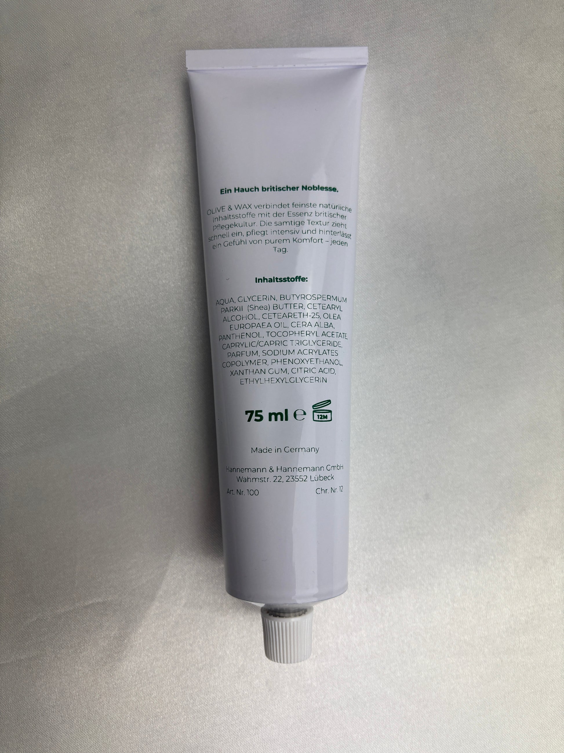 „OLIVE & WAX verbindet feinste natürliche Inhaltsstoffe mit der Essenz britischer Pflegekultur. Die samtige Textur zieht schnell ein, pflegt intensiv und hinterlässt ein Gefühl von purem Komfort – jeden Tag.“